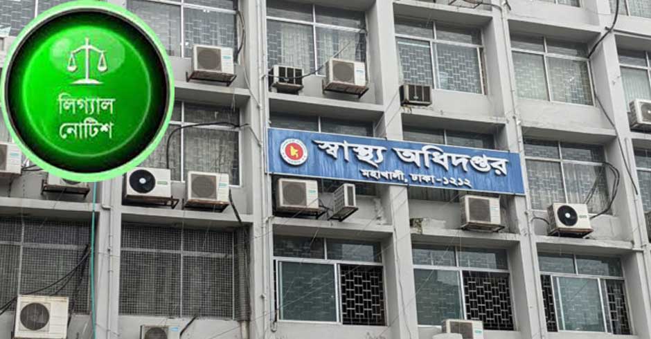 লাইসেন্সবিহীন ক্লিনিক, হাসপাতাল বন্ধে স্বাস্থ্য অধিদপ্তরের মহাপরিচালককে লিগ্যাল নোটিশ পাঠানো হয়েছে। নোটিশে লাইসেন্সবিহীন মেডিকেল, ক্লিনিক এবং হাতুড়ি ডাক্তারসহ দেশব্যাপী চিকিৎসা ব্যবস্থায় ডাক্তার, নার্স, স্টাফদের অবহেলাজনিত কারণে ক্ষতিগ্রস্ত আহত, মৃত্যুর ঘটনায় জড়িতদের বিরুদ্ধে কেন আইনি ব্যবস্থা গ্রহণ করা হবে না জানতে চাওয়া হয়েছে।