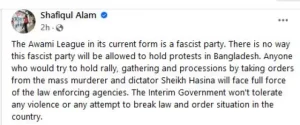 প্রেস সচিব শফিকুল আলম তার ফেসবুক পোস্টে লেখেন, আওয়ামী লীগ বর্তমানে একটি ফ্যাসিবাদী দল। এই ফ্যাসিবাদী দলের বাংলাদেশে প্রতিবাদ করার কোনো সুযোগ নেই। গণহত্যাকারী ও স্বৈরশাসক শেখ হাসিনার নির্দেশ নিয়ে কেউ সমাবেশ ও মিছিল করার চেষ্টা করলে আইনশৃঙ্খলা রক্ষাকারী বাহিনীর পূর্ণাঙ্গভাবে মোকাবিলা করবে। অন্তর্বর্তী সরকার কোনো সহিংসতা বা দেশের আইনশৃঙ্খলা পরিস্থিতি ভঙ্গের কোনো প্রচেষ্টাকে বরদাশত করবে না।