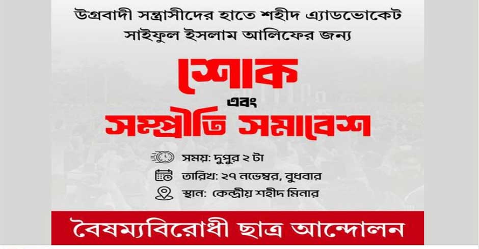 চট্টগ্রামে আইনজীবী সাইফুল ইসলাম ওরফে আলিফকে হত্যার ঘটনায় আজ বুধবার (২৭ নভেম্বর) দুপুর ২টায় রাজধানীর কেন্দ্রীয় শহীদ মিনারে শোক ও