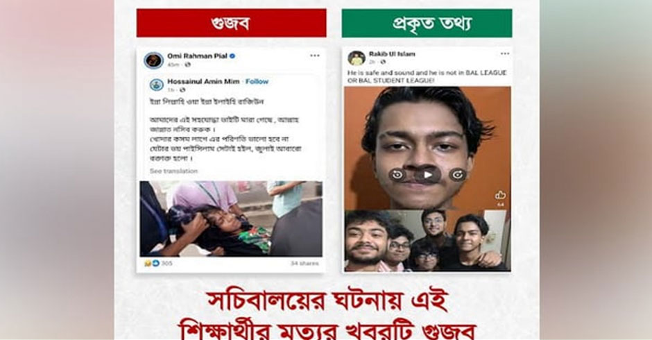 সচিবালয়ে আন্দোলনের সময় এক শিক্ষার্থীর মৃত্যু হয়েছে বলে সামাজিক যোগাযোগ মাধ্যমে ছড়ানো খবরটি গুজব বলে জানিয়েছে রিউমার স্ক্যানার। ভুয়া
