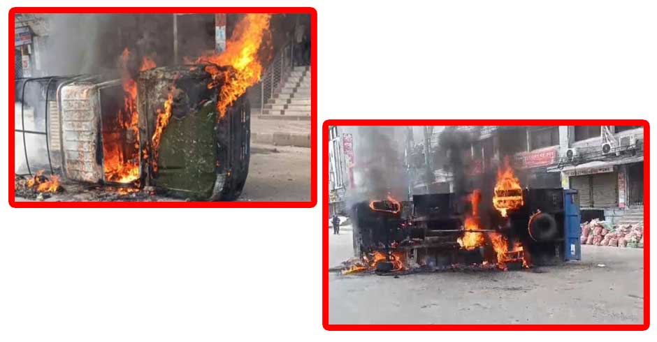 রাজধানীতে সেনাবাহিনীর গাড়ি ও পুলিশের লেগুনায় আগুন